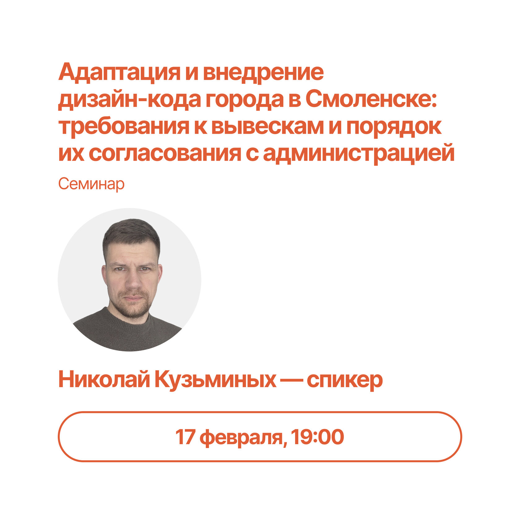 17 февраля состостоялся семинар «Адаптация и внедрение дизайн-кода города в Смоленске: требования к вывескам и порядок их согласования с администрацией», спикер Николай Кузьминых.